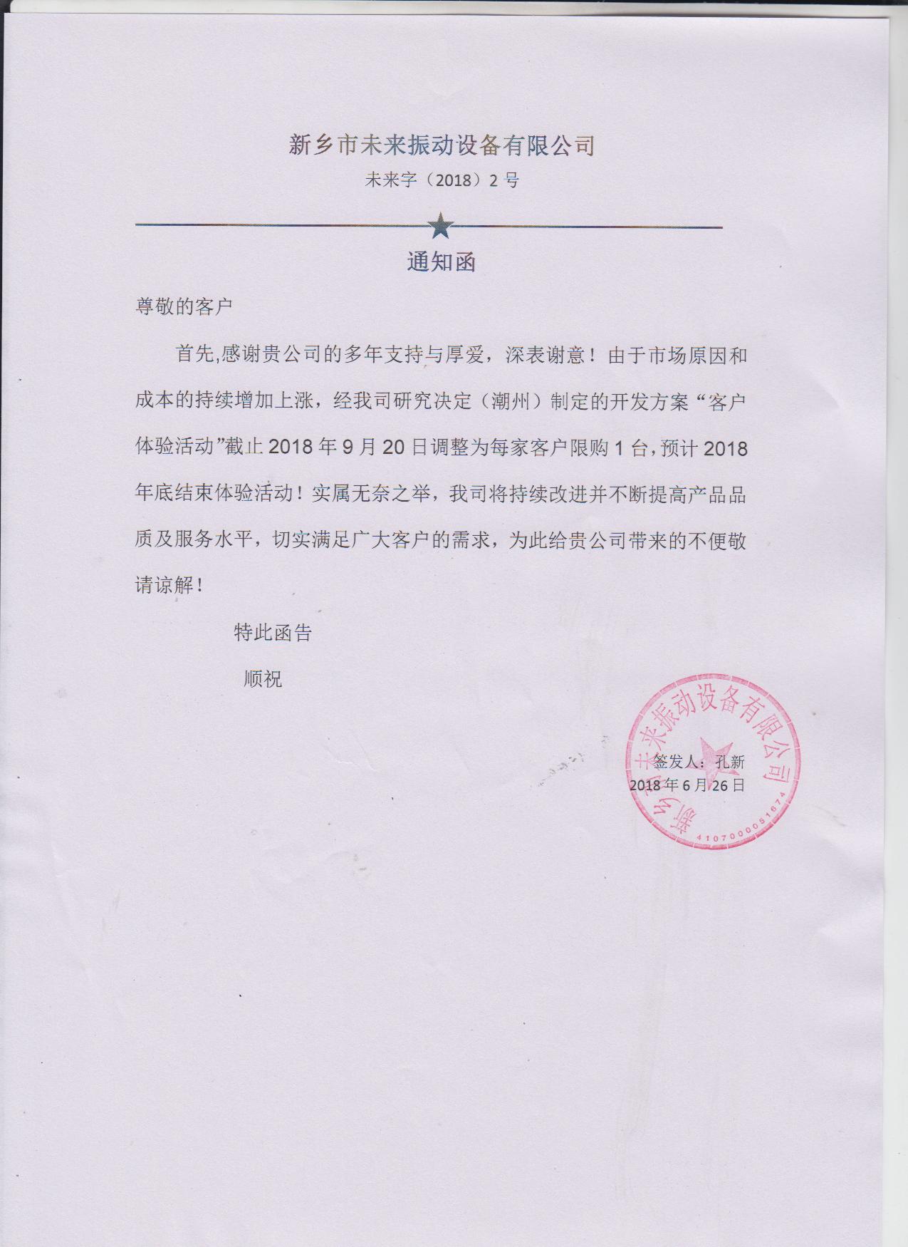 **先感謝貴公司的多年支持與厚愛,深表謝意!由于市場原因和成本的持續(xù)增加上漲經(jīng)我司研究決定(潮州制定的開發(fā)方案“客戶體驗活動”截止2018920日調(diào)整為每家客戶限購1臺,預計2018年底結(jié)束體驗活動!實屬無奈之舉,我司將持續(xù)改進并不斷提高產(chǎn)品品質(zhì)及服務水平,切實滿足廣大客戶的需求,為此給貴公司帶來的不便敬請諒解!